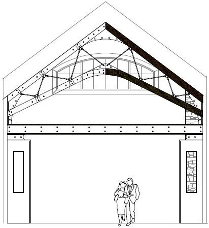 Self-supporting trusses hand assembled in place. Locally milled ash wood meets laser cut iron.